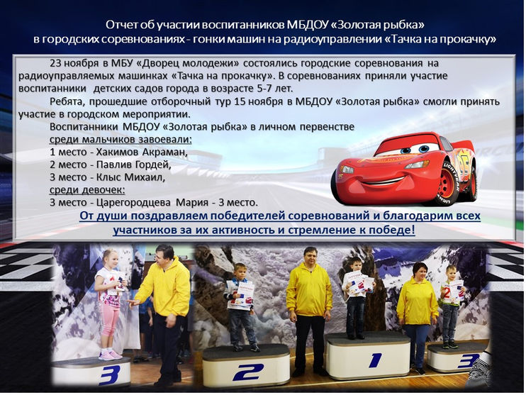 Так команда МБДОУ "Золотая рыбка" принимала участие в гонках раиоуправляемых машин, в результате которых было завоёвано 2 место в личном первенстве.